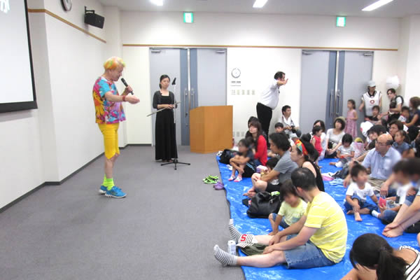 大和ハウスグループ小山市店エリア感謝祭記念 「志茂田景樹の絵本読み聞かせ」 会場は大和ハウス工業の栃木二宮工場内にある多目的施設でした。 この日は34度前後の酷暑でしたが、敷地内には紅白のテントが張られ周りに模擬店が多数出て賑わっていました。 会場は屋内なので冷房が程よく利いていました。 この日の「よい子に読み聞かせ隊」メンバーは隊長の僕、マネージャーの妻光子、フルーティストの仁平真弓の3人でした。 仁平さんは音大1年生時代からのメンバーで、 同じ栃木の真岡出身です。